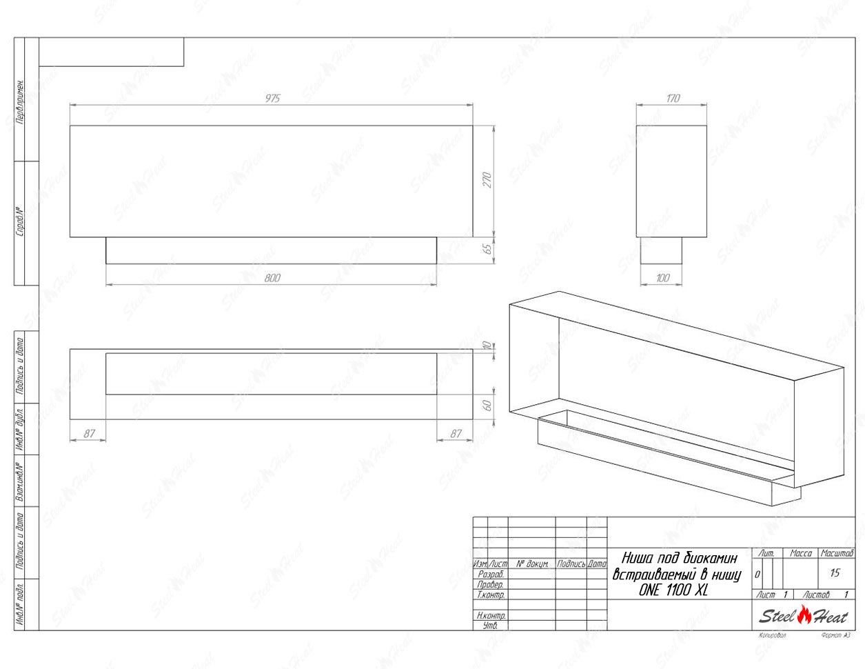 Встраиваемый Биокамин SteelHeat ONE-H 1100 XL предназначен для встраивания в глухие ниши из гипсокартона, кирпича, пеноблоков, бетона.